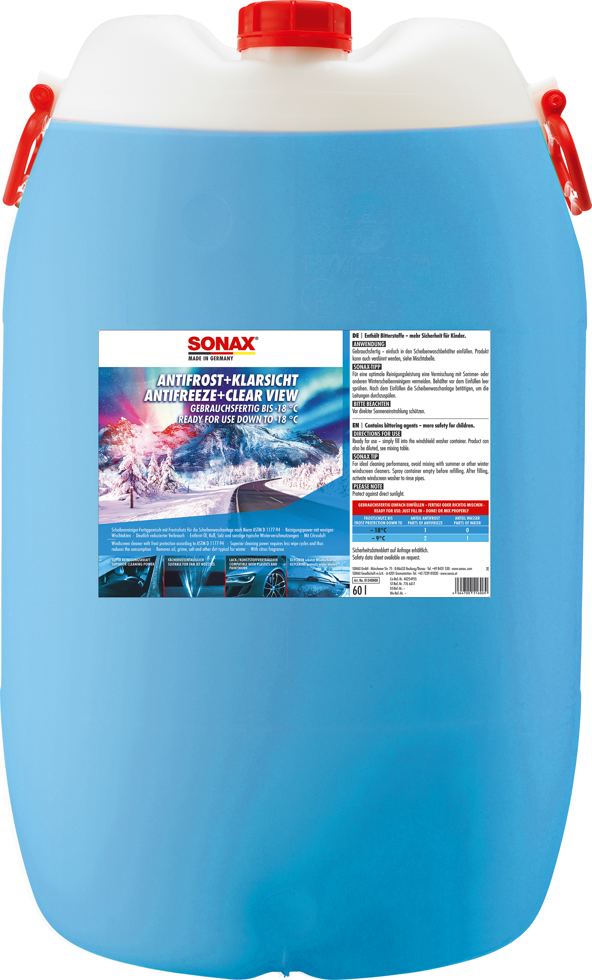 Windscreen cleaner with pleasant citrus fragrance for the windscreen washer during winter. Freeze prevention down to -18°C. Removes oil, soot, salt and other dirt typical for winter with a few wipe cycles and thus reduces consumption. Prevents the nozzles and windscreen washer from freezing. 100 % compatible with paint, rubber and plastics. Does not cause stress cracks and dull spots on headlamp diffusers. Well suitable for high-quality laser, matrix LED and XENON headlamps. Tested on matt paintwork, wrapped vehicles and sensitive refinishing paintwork. With glycerine. Keeps rubber supple. No wiper blade rubbing. Suitable for fan jet nozzles — also ideal for use with new wiper technologies.