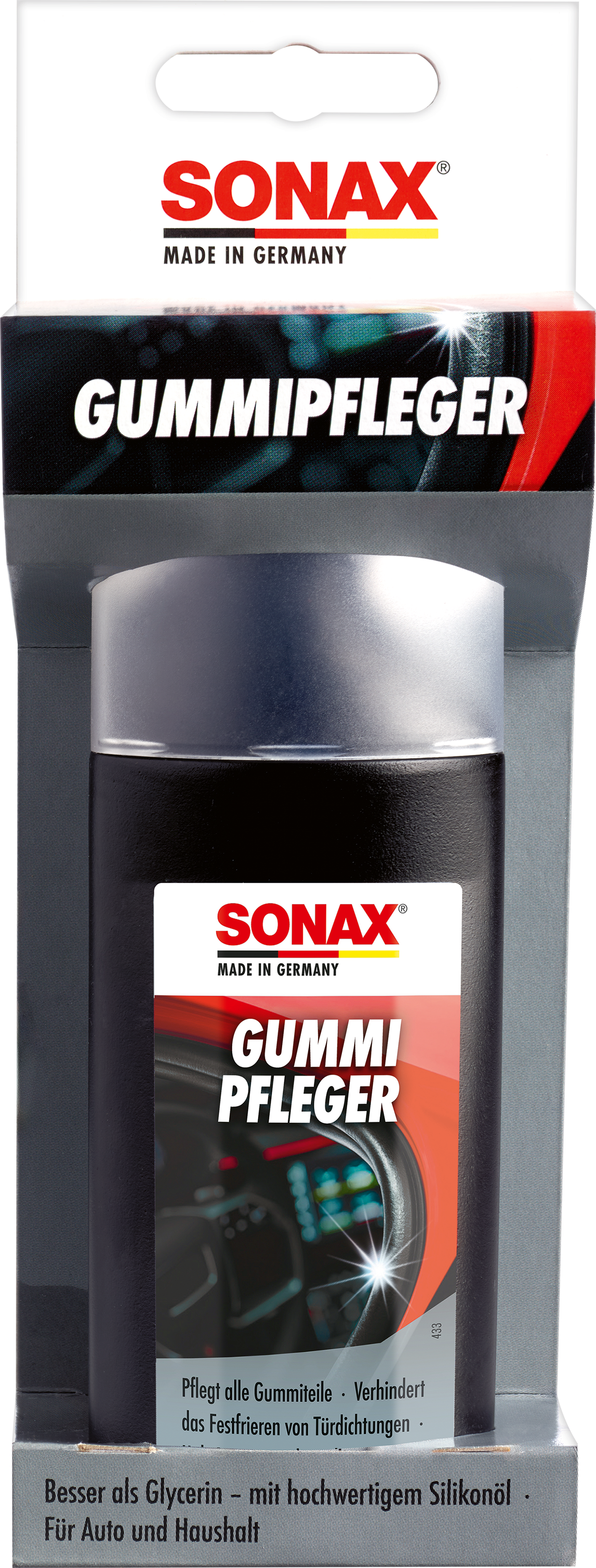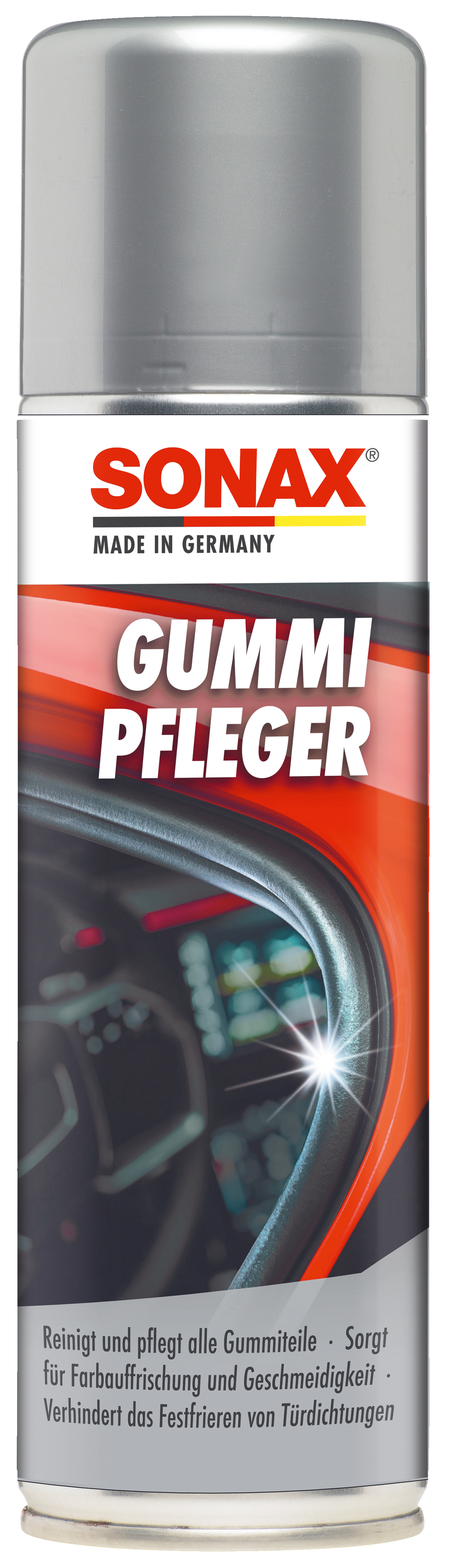 Shake bottle well. Remove protective cap. Press the bottle onto the rubber several times with the applicator sponge facing downward to release the active ingredients. Evenly apply and spread SONAX Rubber Protectant to the dry surfaces using the sponge applicator. Then wipe with a cloth and leave for 5 minutes. Do not close the treated door during the exposure time. Replace protective cap after use. Do not spray pedals and bicycle or motorcycle wheels.