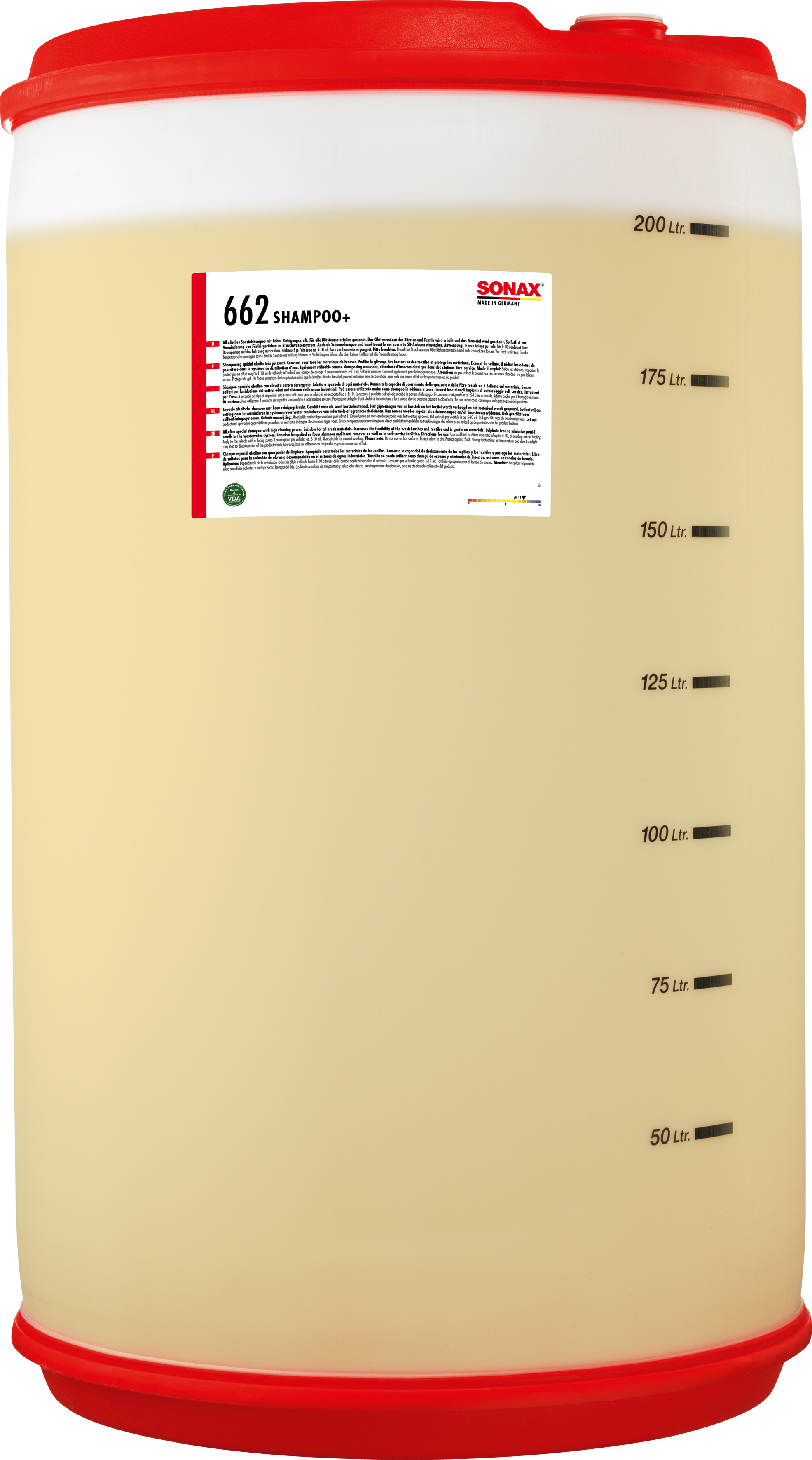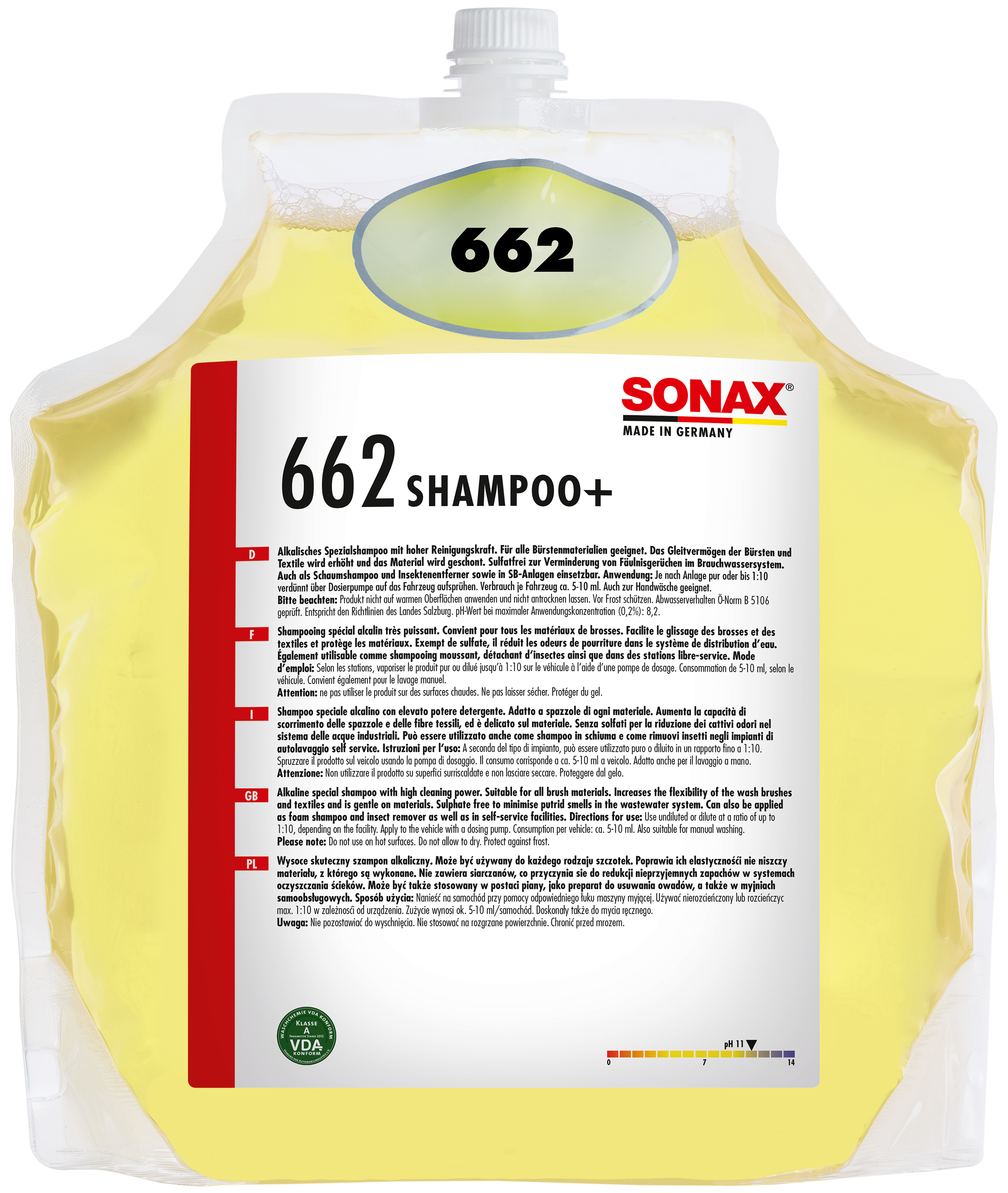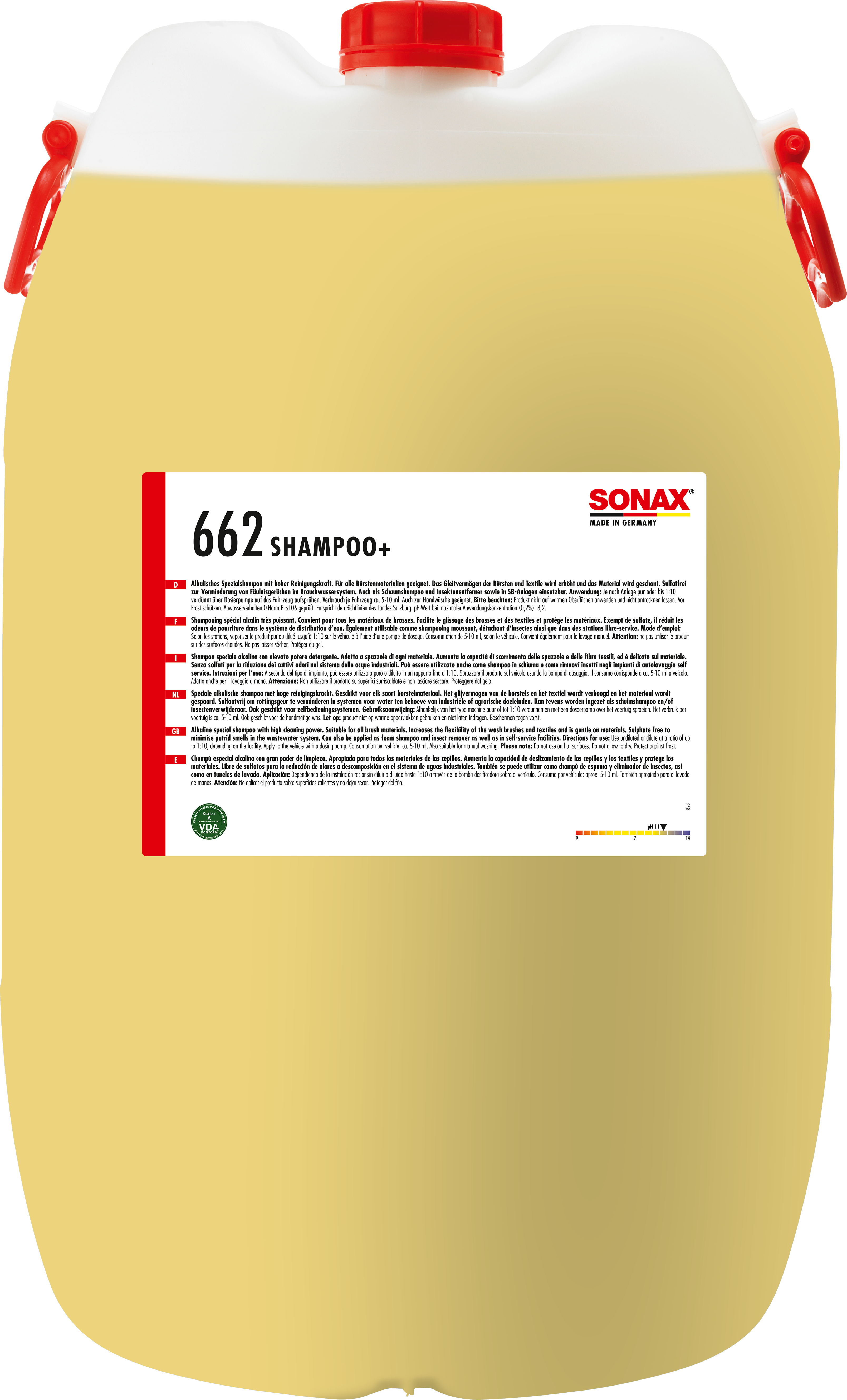 Use undiluted or predilute in a ratio of up to 1:10, depending on the facility. Apply to the vehicle with a dosing pump. Consumption per vehicle: approx. 10-15 ml. Also suitable for manual washing. After shampooing, rinse shampoo residues thoroughly with clear water to prevent them from drying and to avoid the formation of water spots.