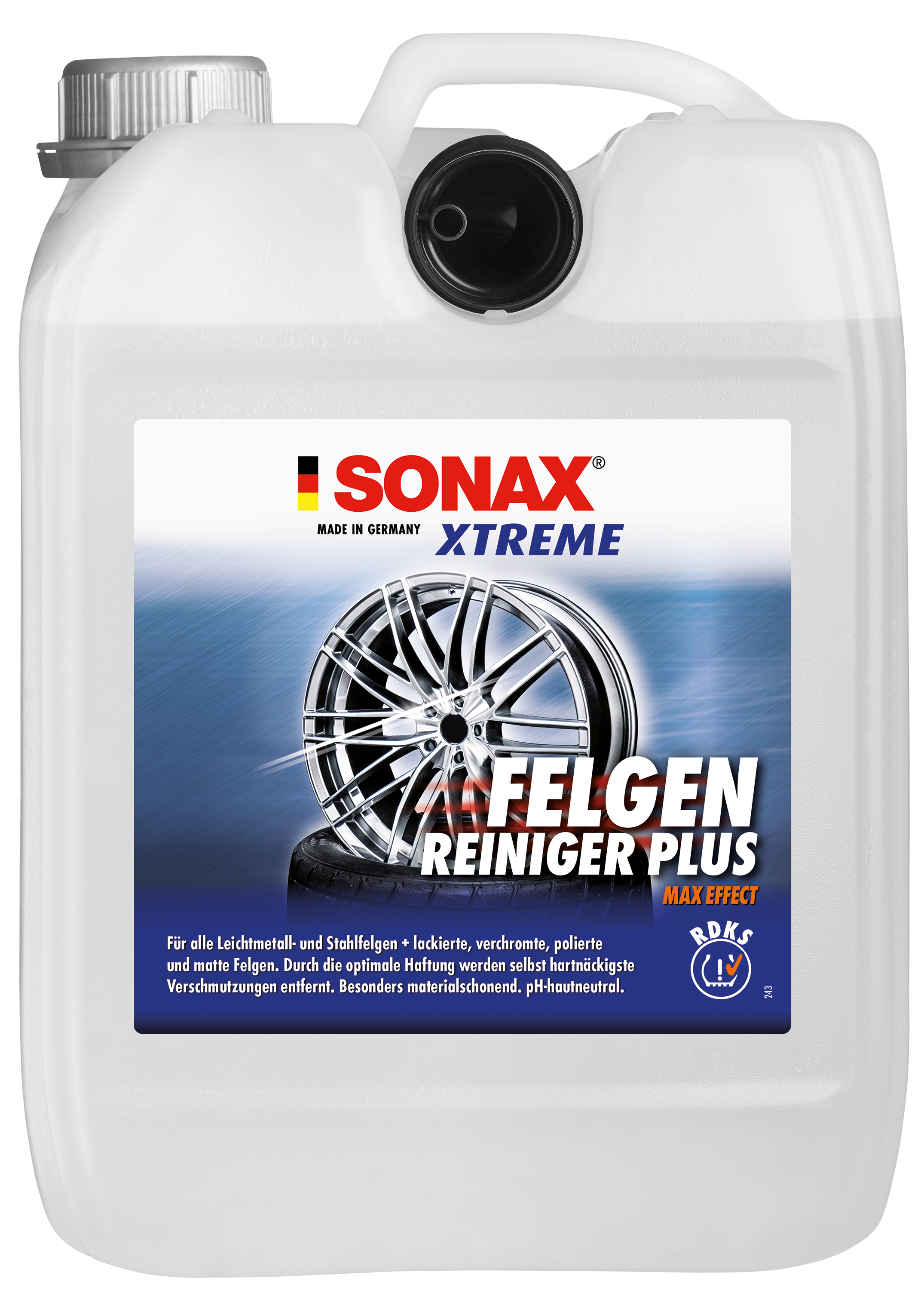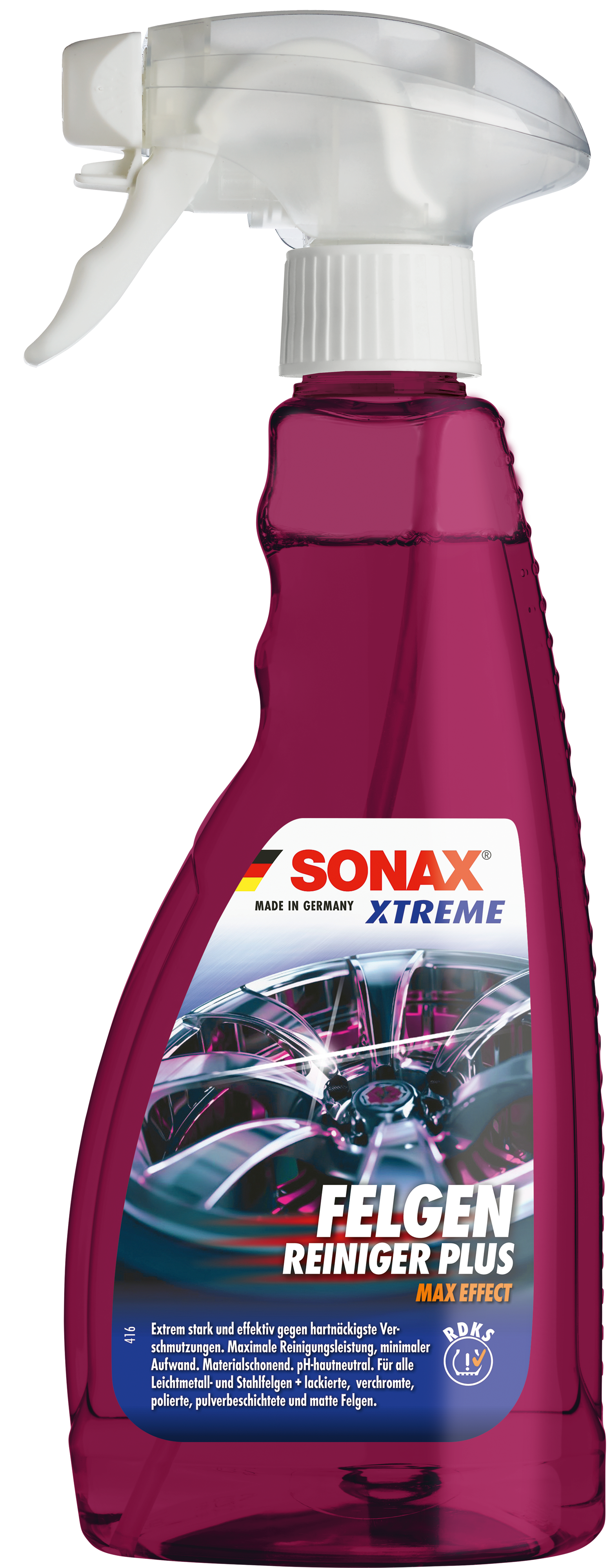 Shake before use. Turn the spray nozzle to spray position. Before use, test for material compatibility in an inconspicuous area. Do not use on repainted rims. Evenly and generously spray cooled rims from a short distance. Allow to work in for 3 to 5 minutes, depending on the extent of soiling. On contact with soil, the cleaner’s colour turns red to indicate its full effect. If necessary, enhance cleaning with a brush, e. g. SONAX Microfibre Wheel Rim Brush — please wear suitable protective gloves. Then rinse thoroughly with a strong water jet or high-pressure cleaner.