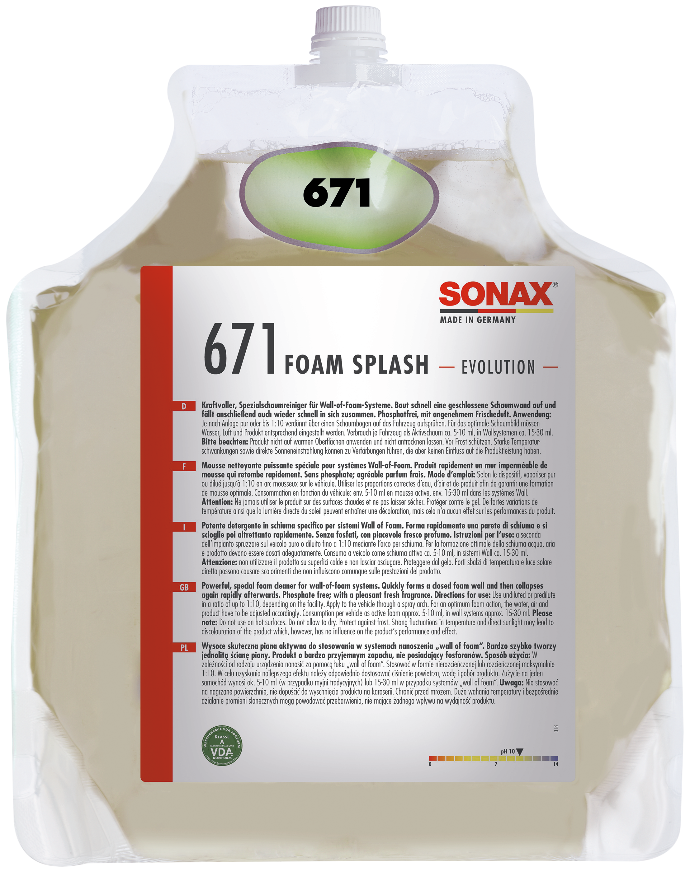 Según el sistema, pulverizar sobre el vehículo puro o diluido hasta 1:10 mediante un arco de espuma. El agua, el aire y el producto deben ajustarse en consecuencia para conseguir el patrón de espuma óptimo. Consumo por vehículo como espuma activa aprox. 5-10 ml, en sistemas de espuma de pared aprox. 15-30 ml.