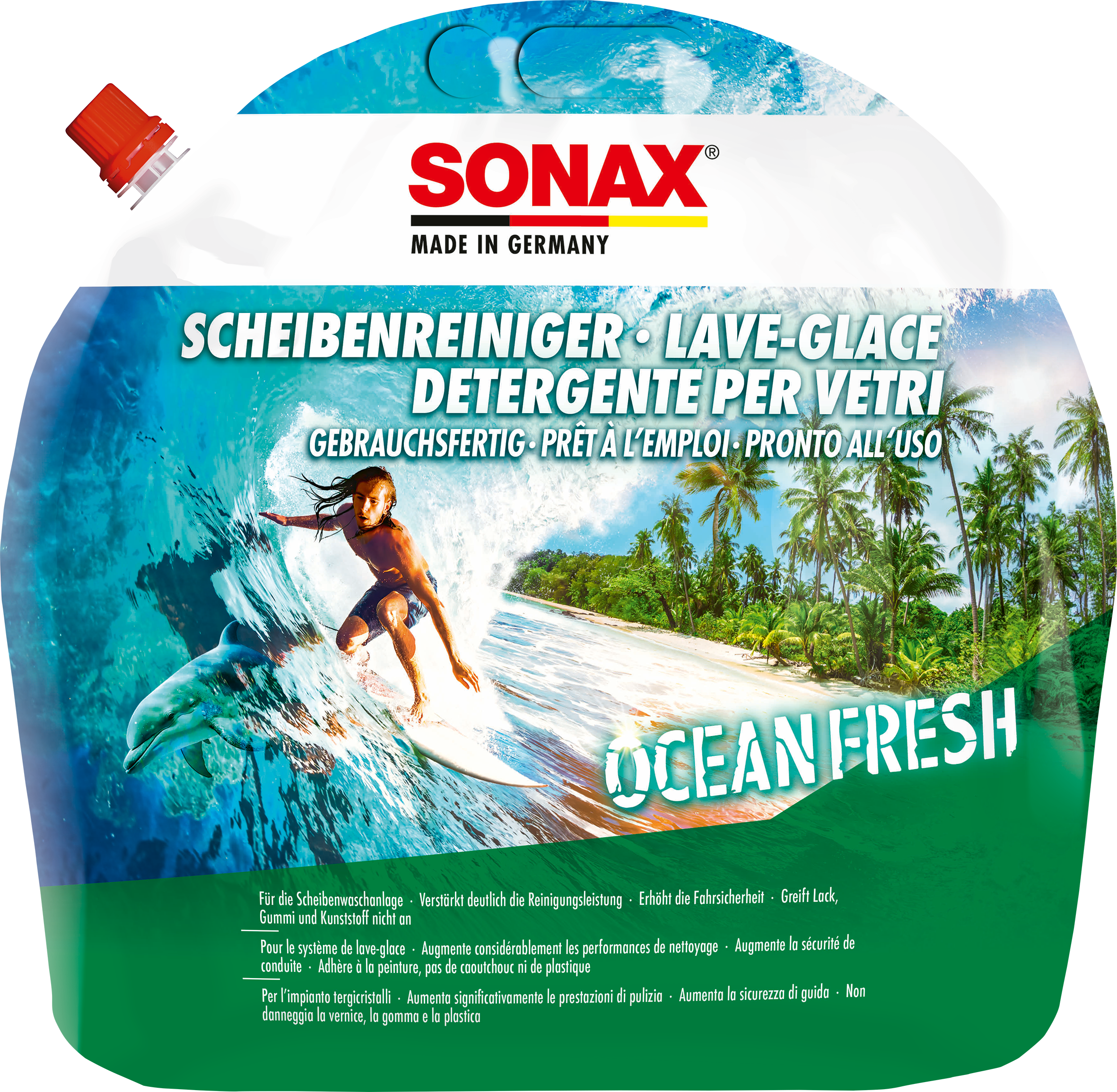 Limpiador listo para usar para el sistema limpiaparabrisas y lavafaros. En pocos segundos proporciona una visión clara sin rayas ni estrías. Elimina de forma rápida y fiable los peligrosos brillos y las películas de suciedad de insectos, aceite y silicona. Máxima compatibilidad con pinturas, gomas y plásticos. No produce grietas por tensión ni puntos opacos en los sensibles cristales de dispersión de los faros. Perfectamente apropiado para faros láser, Matrix LED y xenón de alta calidad. Ideal para utilizar con las nuevas tecnologías de los limpiaparabrisas y las boquillas tipo abanico. También se ha probado en pinturas mate, vehículos laminados y pinturas de reparación sensibles. Máxima seguridad gracias a los ciclos de limpieza minimizados, especialmente en situaciones críticas como lluvia, oscuridad y contraluz. Con una fresca fragancia Ocean-fresh de moda.